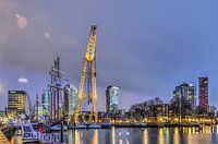 Sinds de havenactiviteiten westwaarts zijn verplaatst zijn de oude haven van de Waterstad vooral in gebruik als openluchtmuseum voor historische schepen; we zien hier onder andere een drijvende kraan en de driemaster Oosterschelde. Het Wijnhaveneiland, rechts, is vooral een woonwijk. Op de achtergrond zijn nog enkele kantoor- en woontorens in de Rotterdamse binnenstad te zien.