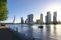 Links in het midden zie je de Erasmusbrug, ook wel de Zwaan genoemd en De Hef laat zich ook nog even zien. De skyline op de Wilhelminapier bestaat uit de Maastoren, KPN Ventures, De Rotterdam, Cruise Terminal Rotterdam waar het cruiseschip CMV Astoria is aangemeerd, Boston & Seattle, Port of Rotterdam, Montevideo en Hotel New York. Het zonlicht schijnt door de gebouwen van Port of Rotterdam en Montevideo en verlichten een deel van het water.