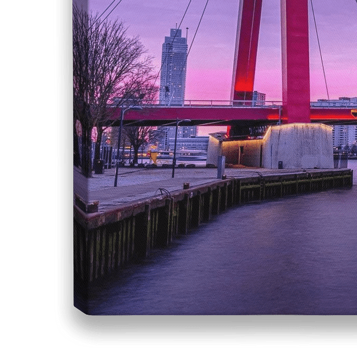 Koop de Rotterdam foto Rotterdam, Willemsbrug bij zonsondergang van U&U Art op canvas, aluminium dibond, (ingelijste) fotoprint, behang en ArtFrame, op maat geprint in Fine-Art kwaliteit.