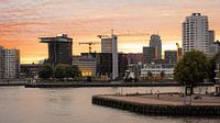 De skyline van Rotterdam bij avondschemering aan de rivier de Maas.
