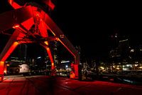 een verlichte kraan op de voorgrond en de skyline erachter op deze nachtopname met mooie reflecties