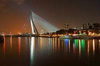 Skyline van Rotterdam in de avond. De Maas, Noordereiland & Erasmusbrug met reflectie van de gekleurde lichtjes in het water.