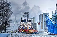 Op deze foto, gemaakt op de Parkkade, komen drie van de elementen samen die Rotterdam zo interessant maken: bruggen (de Hef en de Erasmusbrug), boten en hoge gebouwen (de Maastoren, het KPN-gebouw en De Rotterdam)