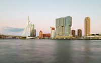 De Erasmusbrug gevangen tijdens het blauwe uurtje, terwijl de lichtjes in de stad Rotterdam langzaam ontstoken worden. Schepen, veerboten, watertaxi's varen af en aan over de Nieuwe Maas. De Erasmusbrug steekt met kop en schouders uit boven de Kop van Zuid. Een mooi sfeerbeeld van de skyline van de havenstad door middel van…