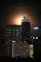 Vanaf mijn balkon heb ik een prachtig uitzicht over Rotterdam waar je onderandere de universiteiten en hogescholen kan zien. Hier je bijvoorbeeld het Erasmus ziekenhuis / universiteit. Een prachtig beeld waarbij de maan een hele warme kleur heeft.
