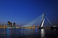 avondopname van de sky-line van Rotterdam met op de voorgrond de Erasmusbrug.