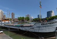 Groninger kustvaarder de Zeemeeuw uit 1937 in de haven van het Maritiem museum in Rotterdam met het stadscentrum op de achtergrond