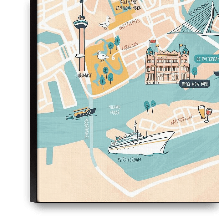 Stadskaart Rotterdam met illustraties van de kubuswoningen, Erasmusbrug, Hotel New York, SS Rotterdam, Markthal en Spido.