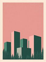 De skyline van Rotterdam gereduceerd tot eenvoudige blokvormen. Het zachte roze contrasteert met donkergroene gebouwen en creëert een rustige, bijna dromerige sfeer. Een minimalistische stadsscène met sterke kleurcombinatie.