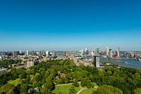 Een overzicht van de stad Rotterdam vanaf de Euromast met de Erasmusbrug centraal in beeld.