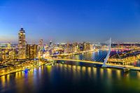 Rotterdam 's nachts vanuit de lucht op de Nieuwe Maas met de Erasmusbrug en de Zalmhaven.