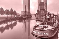 Een monochroom-uitvoering van een foto van de Wijnhaven in Rotterdam ter hoogte van het Witte Huis, gemaakt op een herfstdag dat mistbanken vanaf de Nieuwe Maas de stad binnentrokken.