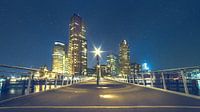 Foto van skyline en hoogbouw Rotterdam. op de voorgrond de Rijnhavenbrug en op de achtergrond wolkenkrabbers. Nachfotografie met groothoeklens, in de nacht en met sterren