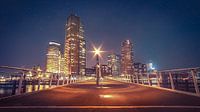 Foto van skyline en hoogbouw Rotterdam. op de voorgrond de Rijnhavenbrug en op de achtergrond wolkenkrabbers. Nachfotografie met groothoeklens, in de nacht en met sterren
