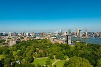 Een overzicht van de stad Rotterdam vanaf de Euromast met de Erasmusbrug centraal in beeld.