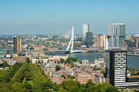 Een overzicht van de stad Rotterdam vanaf de Euromast met de Erasmusbrug centraal in beeld.