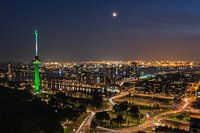 Skyline van Rotterdam bij nacht vanaf het dak van het Erasmus MC met de euromast op de voorgrond.