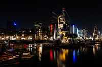 Rotterdam in de haven bij de Erasmusbrug ligt de zandzuiger verlicht met op de achtergrond de skyline over het water bij nacht.