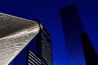 Rotterdam Centraal Station met het gebouw van Nationale Nederlanden erachter. De 'sterren' die op de gevel van het gebouw zitten, geven de foto iets magisch.