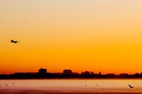 Een vliegtuig stijgt 's ochtends op vanaf Rotterdam Airport. De skyline op de achtergrond.