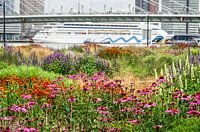 Echinacea, kattenstaart en andere bloemen in het parkje op het Leuvehoofd bij de rivier Nieuwe Maas in Rotterdam met .op de achtergrond het dek van de Erasmusbrug en de Wilhelminapier met een aangemeerd cruiseschip