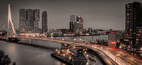 Skyline van Rotterdam in de avond met de Erasmusbrug. Kleuren zijn zwart-wit met hier een daar de kleur rood van de autolampen en geel van de verlichting.