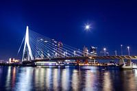 De prachtige stad Rotterdam bij nacht. Op de voorgrond de mooie brug die iedereen kent. De Erasmusbrug. Een echt Nederlands icoon. Achter deze Erasmusbrug is de prachtige skyline van wolkenkrabbers zichtbaar van Rotterdam. Gefotografeerd tijdens een heldere nacht. De volle maan hangt in zijn volle glorie boven de stad.