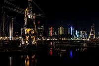 nachtfoto van de zandzuiger die verlicht in de haven ligt met de gekleurde flats op de achtergrond en in de verte de verlichte Erasmusbrug.