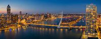 Avondpanorama van de skyline van Rotterdam vanaf een hoogte aan de Nieuwe Maas met de Erasmusbrug en de Zalmhaven. De brug, die vaak de "Zwaan" wordt genoemd vanwege zijn sierlijke vorm, verbindt het noordelijke en zuidelijke deel van de stad. Op de achtergrond torent de Zalmhaven, een opvallende wolkenkrabber met zijn scherpe, hoekige lijnen, boven de skyline uit. De straten beneden gonzen van de activiteit terwijl de moderne architectuur van de stad trots in de verte staat, badend in zacht stedelijk licht. Boven de heldere hemel staan een paar sterren die nauwelijks zichtbaar zijn door de felle gloed van de stadslichten, wat bijdraagt aan de futuristische maar serene sfeer van Rotterdam bij nacht.