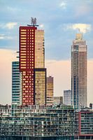 Rotterdam skyline met wolkenkrabbers op de Kop van Zuid tijdens een mooie vroege ochtend. De Montevideo en Zalmhaven staan hoog tussen omgebouwde pakhuizen en kantoorgebouwen.