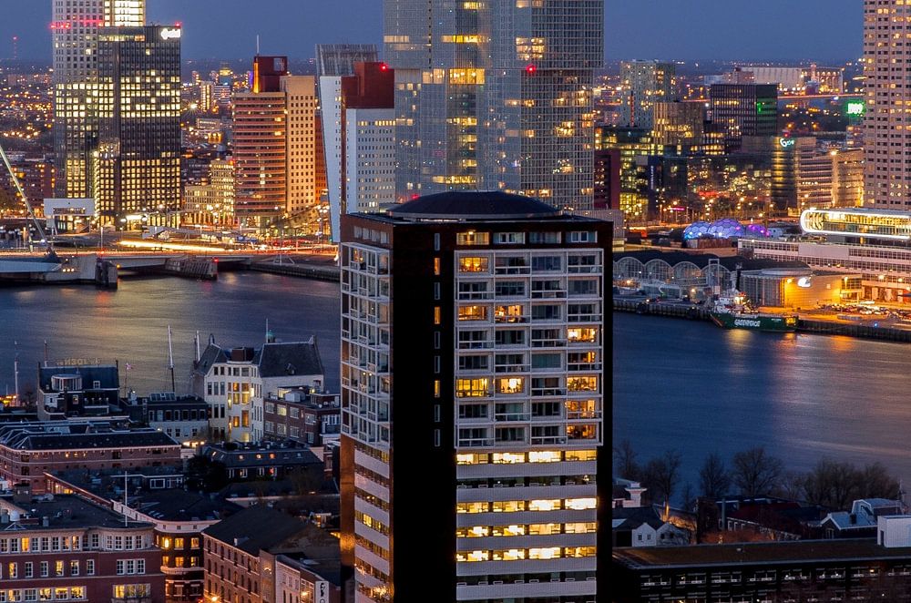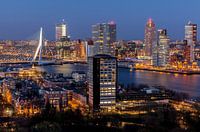 Uitzicht op de stad Rotterdam vanaf de Euromast, avondopname. Erasmusbrug
