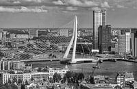 Zwartwit opname van de kop van zuid en de erasmusbrug vanaf de euromast.