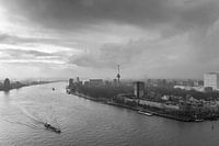 Zwartwit opname van Rotterdam vanaf het world port center op de kop van zuid met de Euromast op de achtergrond.