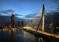 Net na de regen keek ik vanaf de Kop van Zuid richting de stad, toen de zon zich nog één keer door de wolken heen wrong. Het blauwe schemerlicht kleurde de Maas bijna staalgrijs, terwijl de lampen langs de Erasmusbrug als een gouden kralensnoer oplichtten. In de verte zie je de bekende woontorens en het ranke silhouet van De Zalmhaven;…