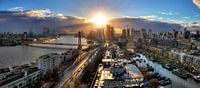 Prachtige panorama van de skyline van Rotterdam tijdens zonsondergang met links de Willemsbrug en Erasmusbrug over de Maas en rechts het centrum