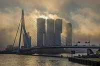 Het lijkt een scene uit een rampenfilm, maar het zijn toch echt de weersomstandigheden. Vanaf de brug over de Leuvehaven gezien lijkt het alsof de Kop van Zuid en Katendrecht in brand staan. Is er een buitenaards ruimteschip neergestort? Nee, het zijn gewoon mistflarden die om de Erasmusbrug en gebouw De Rotterdam hangen en aangelicht…