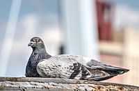 Een stadsduif rust op een meerpaal bij de kade van de Nieuwe Maas in Rotterdam. Op de achtergrond zien we vaag de contouren van de Erasmusbrug en de Kop van Zuid