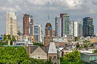 Deze foto is gemaakt in de zomer van 2022 vanaf het dak van het Nieuwe Instituut, dat op dat moment toegankelijk was voor het publiek. We zien een mooie rijtje torens, veertien in totaal. De meeste zijn recente aanwinsten voor de skyline maar dat geldt niet voor de meest nabije: de toren van de Arminiuskerk.