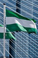 De Rotterdamse vlag, wapperend op de Boompjes langs de Nieuwe Maas. Het groen-wit-groen symboliseert de Rotte die tussen weilanden stroomt. Op de achtergrond zien we, geblurd maar herkenbaar, de tuien van de Erasmusbrug en de gevel van De Rotterdam
