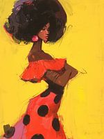 Rouge Rhythm - Dit vrouwen schilderij toont een elegante dame met een weelderige bos krullen en een opvallende rode jurk met zwarte stippen tegen een levendig gele achtergrond.