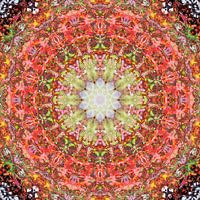 Een caleidoscopisch beeld met een sterke cirkelvormige opgezet, gebaseerd op een foto van rode en bruine eikenbladeren in de herfst.