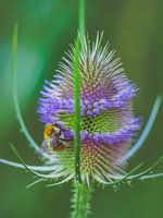 Een close-up van een bij op een Kaardenbol, een Dipsacus fullonul, Dipsacus Sylvestris tegen een groene achtergrond