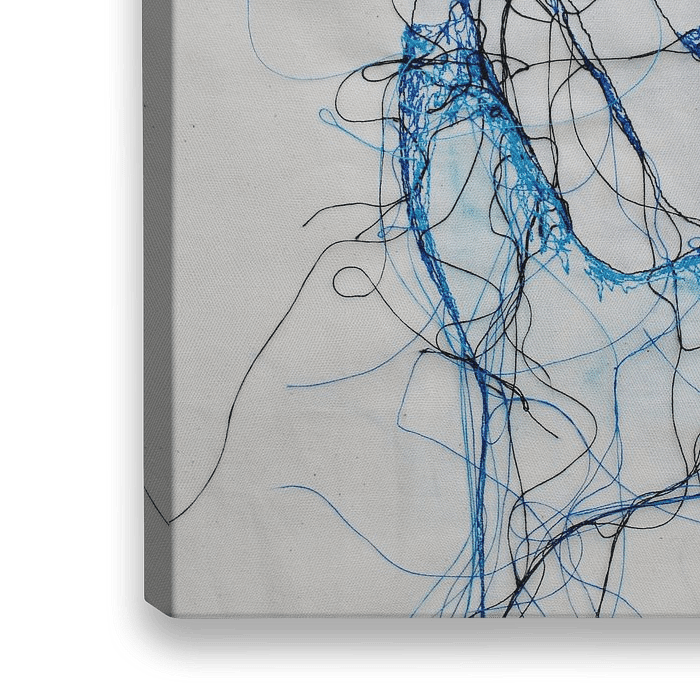Een figuratief werk van draad op doek. Er is gebruik gemaakt van blauw draad, antiek kant & houtskool.