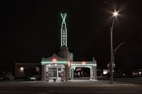 Een avond foto van de U-Drop Inn, ook bekend als Tower Station en U-Drop Inn and Tower Café. Dit benzine station werd in 1936 gebouwd in Shamrock, Texas langs de historische Route 66-snelweg in Wheeler County.