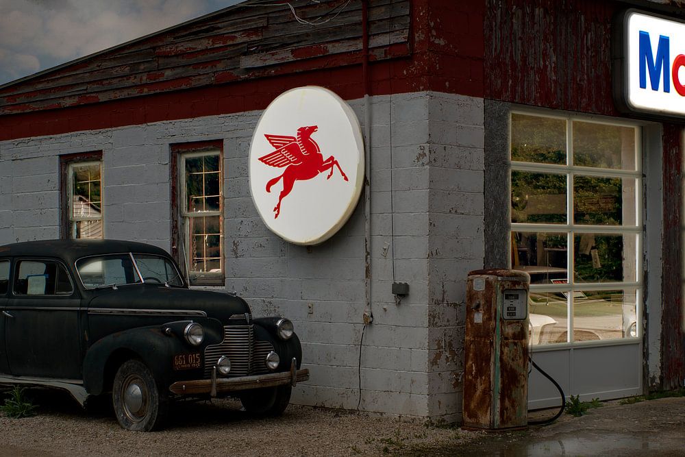 Mobil garage in Odell Illinois aan de route 66.