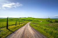 Route van de Via Francigena, kronkelende weg, graanvelden en bomen.