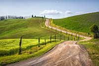 Route van de Via Francigena, kronkelende weg, graanvelden en bomen.
