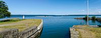 Uitgang van het Göta-kanaal: sluisdeuren bij Berg naar het Roxenmeer, Zweden.
