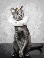 Abstract schilderij in Gustav Klimt schilder stijl,portret van een koninklijke kat met kroontje en plooikraag.