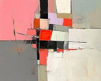 Roze Balans - Dit abstracte schilderij toont een harmonieuze compositie van overlappende geometrische vormen in tinten van roze, zwart, wit, en opvallend rood, wat een gevoel van rust en balans oproept.